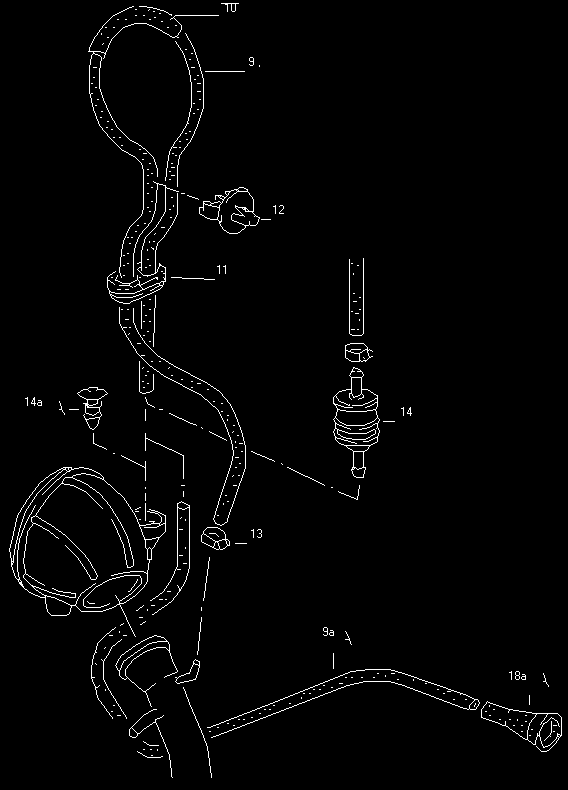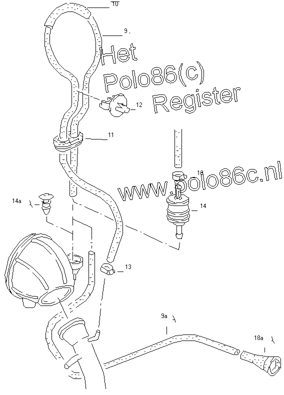 Klik hier voor een print-versie van de tekening (13) Aansluiting op de vulhals: Het kleine ophoog stekende puntje van ongeveer 4 mm doorsnede steekt naar boven uit. De andere aansluiting op de foto is de veel dikkere (1 cm dikke tuinslang) circulatie aansluiting. Via (11) gaat de lang omhoog door het blik/metaal van het binnenscherm naar het interieur. Klem 12 en bocht 10 bevinden zich achter de bekleding naast de achterbank. Vervolgens gaat de slang weer via (11) naar buiten. Buiten aangekomen gaat de slang dus of linea recta naar de achteras, waar ze uitmond in tuutje 18a. De opening in de rubberen kraag is dan afgedopt met dopje 14a. (dit geldt voor de meeste nederlandse auto's). OF mond de slang uit via de zwaartekrachtklep (14) in de rubberen kraag. Voor auto's met actief-kool absorptie filter (o.a. NZ, 3F, PY en AAK) loopt er vanaf het voorscherm nog een ontluchtingingsslang naar de rubberen kraag. Hoe deze daar precies is aangesloten: Beats me: info mailen naar: hoezitdeontluchtingslangbijdenz3fpyenaak@86c.nl  |